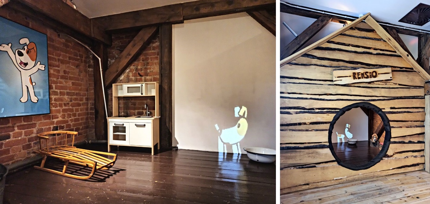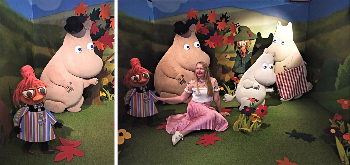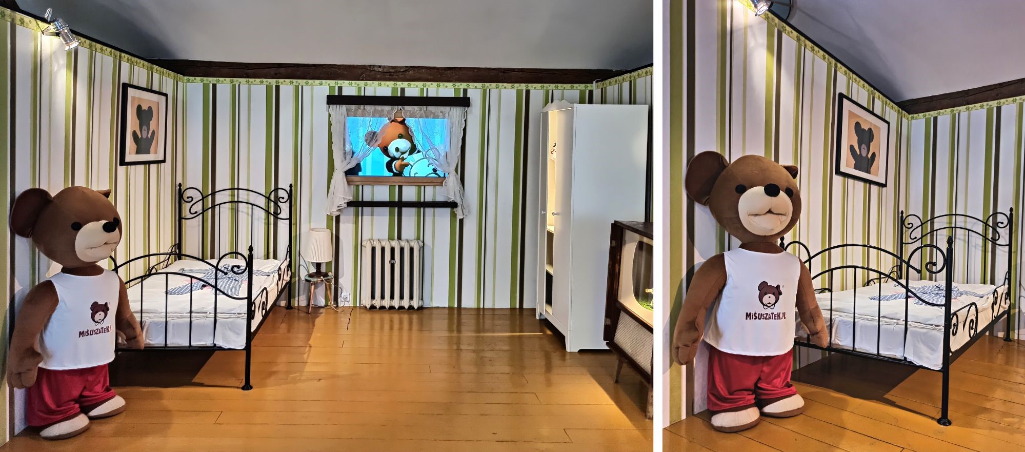 Wystawa znajduje się na przytulnym drewnianym strychu, gdzie każdy bohater ma własny pokój. Można zobaczyć, jak swoją budę urządził zaradny Reksio lub przenieść się na biegun polarny wprost do igloo sympatycznego Pingwina Pik-Poka. To jednak nie wszystko. Miłośnicy morskich wojaży mogą stanąć za sterem statku Bolka i Lolka, wyposażonego w prawdziwe liny okrętowe oraz koło ratunkowe. Jednak najchętniej odwiedzanym rezydentem tej części wystawy jest bez wątpienia Miś Uszatek. Możemy nie tylko zajrzeć do pokoiku sympatycznego niedźwiadka, ale również zobaczyć, co Uszatek trzyma w szafie. W pomieszczeniu stoi także łóżeczko ze słynną niebieską piżamką w kratkę, telewizor i oryginalna kukiełka misia z filmów realizowanych w Se-ma-forze. Niedaleko znajduje się jej powiększona replika w formie przytulanki. Uszatek szykuje się do spania, a tymczasem nieopodal nad Doliną Muminków wschodzi słońce. Zdjęcie z rodziną sympatycznych trolli wraz z Małą Mi to świetna pamiątka – wiem, co mówię. Co prawda Muminki wyglądają normalnie, tzn. tak jak w bajce, za mój ulubieniec Włóczykij ma „nieco” demoniczny wyraz twarzy, a Mała Mi wygląda, jakby nie spała od co najmniej tygodnia… 😀