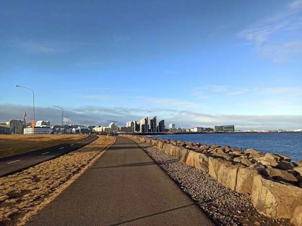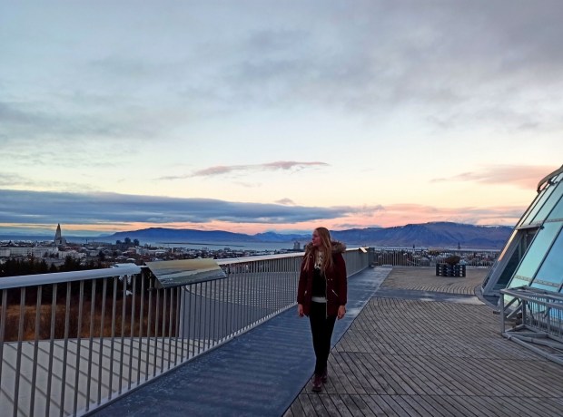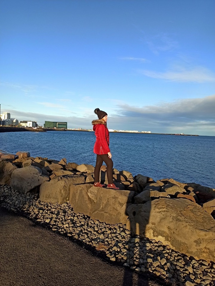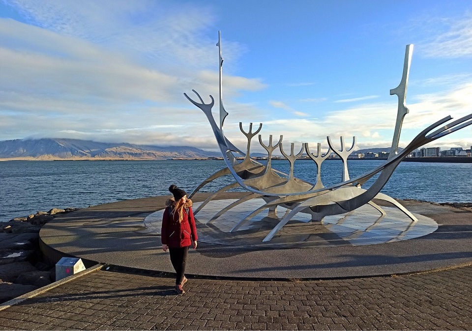 Spacerując po tamtejszej promenadzie, prędzej czy później dotrzemy do miejsca okupowanego przez rzesze turystów. Dlaczego? Znajduje się tam oryginalna rzeźba (pomnik?) Sun Voyager, nazywana również Sólfar albo “Odą do Słońca”, która jest najbardziej rozpoznawalną rzeźbą w całym Reykjaviku. To stalowa rzeźba ustawiona z okazji obchodów 200-lecia miasta, swym kształtem nawiązująca do łodzi Wikingów. Fakt, musiałam „chwilę” poczekać, żebym i ja mogła sfotografować się na tle Sun Voyagera 🙂 Szlak, który nazywa się Sculpture and Shore Walk, ma długość około 3 km. Po drodze, oprócz wspomnianej rzeźby, zobaczymy też m.in.: niewielką latarnię Höfði – pomnik z okazji 50 rocznicy partnerstwa pomiędzy Islandią i Stanami Zjednoczonymi. W mroźny, ale też piękny i słoneczny dzień spacer po promenadzie to prawdziwa przyjemność.