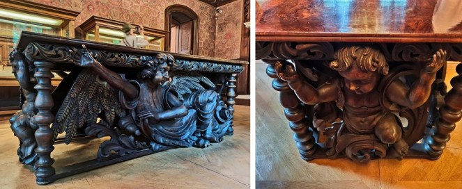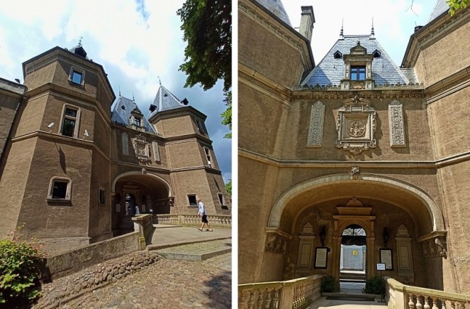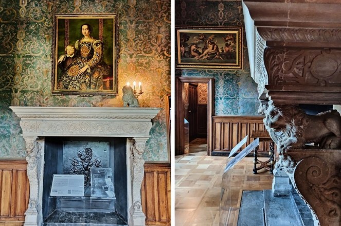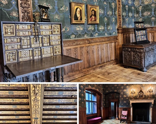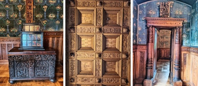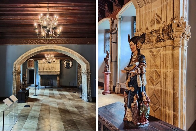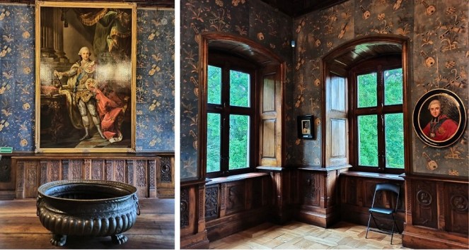 Jak już wspomniałam, hitlerowcy w trakcie II wojny światowej celowo rozgrabili zamek, a to czego nie zdołali ukraść, zniszczyli. Wnętrza są skromne, a eksponatów niewiele pozostało, ale mimo wszystko robią wielkie wrażenie. W każdej sali znajdują się czarno-białe zdjęcia sprzed wojny, ukazujące to, jak wnętrza kiedyś wyglądały.