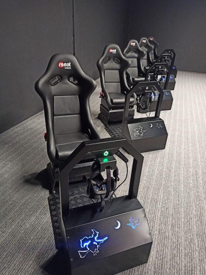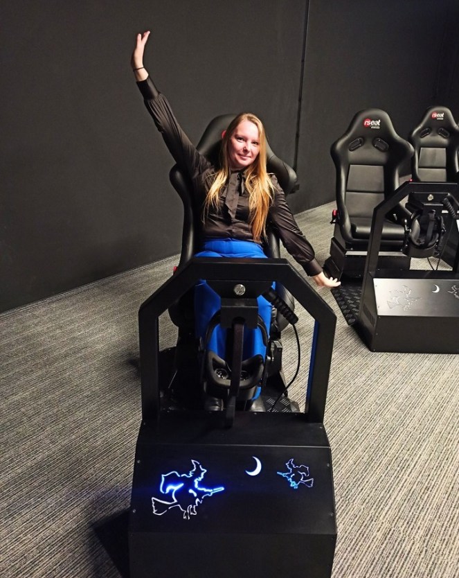 Kończąc naszą podróż przez legendy świętokrzyskie mamy jeszcze jedną nie lada atrakcję – możemy skorzystać z symulatora lotu na miotle! Tak, dobrze czytacie 🙂 Jednak nie wygląda to tak, jak sobie pomyśleliście – żadnej miotły i miotłopodobnego urządzenia między nogami nigdzie nie znajdziecie 🙂 O co więc chodzi? Wychodząc z kina i kierując się po schodkach na górę, znajduje się stanowisko z fotelami, które mają symulować wspomniany lot. Rozsiadamy się wygodnie, zakładamy gogle VR i zaczynamy zabawę – możemy poczuć się jak prawdziwa czarownica na miotle 🙂 W trakcie „lotu” możemy rozglądać się wokoło, podziwiając panoramę Świętokrzyskiego. Ta wirtualna przejażdżka to również podróż po głównych atrakcjach województwa. Zabawa przednia, jak dla mnie to bez wątpienia najlepsza atrakcja w całym Parku. Ja byłam zachwycona i polecam każdemu 🙂