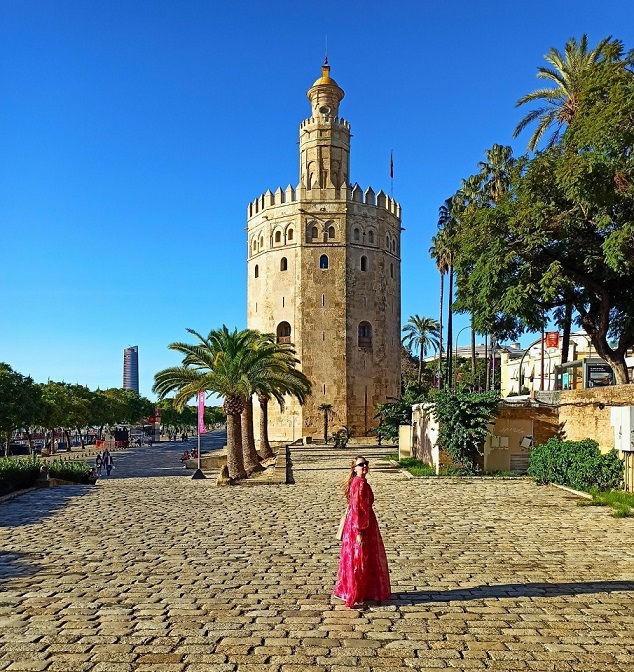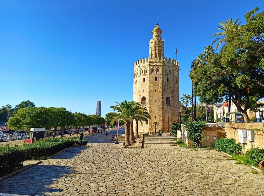 Torre de Oro, czyli Złota Wieża również stanowi swoisty symbol stolicy Andaluzji. Wieża ma 36 metrów wysokości i ok 16m średnicy, zaś w przekroju jest dwunastokątem, czyli składa się z aż 12 boków. Doskonale pamięta czasy panowania muzułmańskiego, bo powstała w XIII wieku. Dumnie stoi i czuwa na wybrzeżu rzeki Gwadalkiwir. Nie przypadkowo wieża znajduje się właśnie tutaj – w czasach hiszpańskiego Złotego Wieku był tu ważny i potężny port. Złota Wieża jest przedstawicielką 166 wież obronnych, które w czasach panowania arabskiego tworzyły system fortyfikacji. Pośród nich wszystkich właśnie ta jedna miała szczególne znaczenie.