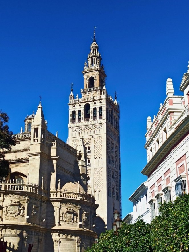Bez wątpienia La Giralda stanowi wizytówkę Sewilli, ale również jest charakterystyczną średniowieczną konstrukcją na obszarze samego starego miasta. 93-metrowa prostokąta wieża powstała w latach 1184-1196, gdy miastem rządzili wówczas Maurowie (Arabowie) i pełniła funkcję minaretu. Mimo że po rekonkwiście sam meczet został całkowicie przebudowany i przekształcony na gotycką katedrę, to ceglana wieża przetrwała praktycznie w pierwotnym stanie. Jej nazwa pochodzi od hiszpańskiego słowa giradillo, które oznacza wiatrowskaz. W odróżnieniu do większości średniowiecznych dzwonnic na szczyt La Giraldy nie prowadzą schody, ale pnąca się w górę droga, która według legend miała umożliwiać wjazd konno.