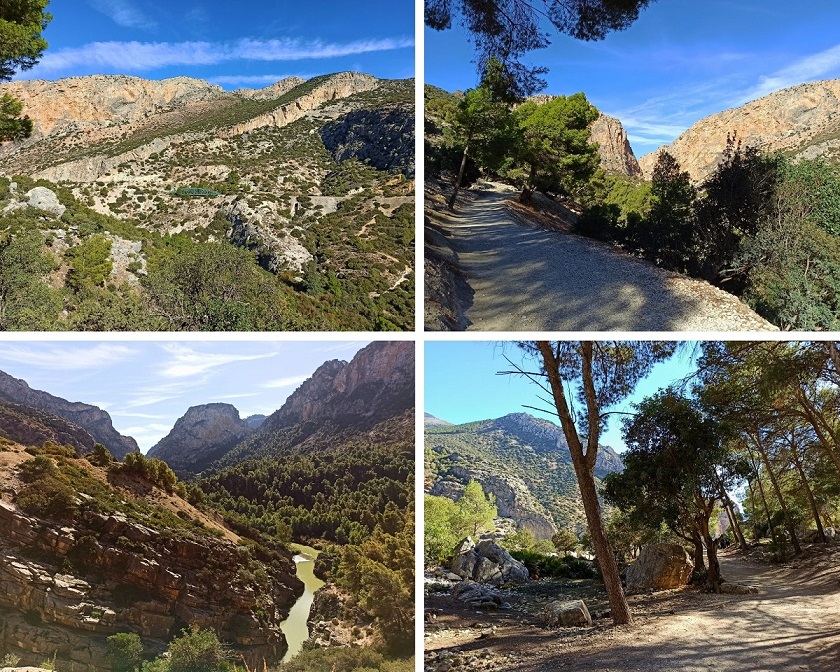 Trasa nie zatacza kręgu i podzielić można ją na kilka etapów. Pierwszy etap, o długości 1,5 kilometra rozpoczyna się u wejścia do tunelu i kończy przy kasie biletowej. Drugi etap to trasa biegnąca wzdłuż zalewu Conde de Guadalhorce i w otoczeniu starych konstrukcji służących do zapory wodnej. Kolejny, ten najbardziej spektakularny w widoki odcinek szlaku biegnie wzdłuż wapiennego wąwozu Desfiladero de los Gaitanes na wysokości nawet powyżej 100 metrów n.p.m. Jego największą atrakcją jest wiszący nad przepaścią most Puente Colgante del Caminito del Rey. Po przekroczeniu mostu, ostatni odcinek mający 2,1 kilometra kończy się tuż obok stacji kolejowej El Chorro na trasie Malaga – Kordoba. Tam też znajduje się toaleta i kilka stoisk, w których możemy coś zjeść, napić się czegoś orzeźwiającego albo kupić pamiątki. Również tam znajduje się przystanek, z którego odjeżdża busik (cena biletu 2,5 €) kursujący pomiędzy wejściem północnym i południowym – to dla tych, którzy przyjechali samochodem i zostawili go na parkingu przy wejściu.