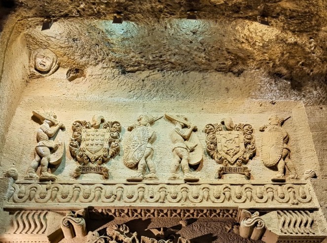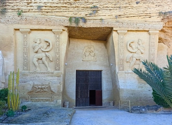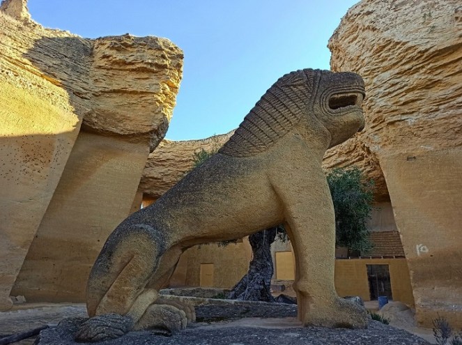 Pierwszym obiektem, na który zwrócimy uwagę są spektakularne rzeźby autorstwa Francisca Valdivii Gomeza. To artysta urodzony w Osunie już w wieku piętnastu lat nauczył się rzeźbić w drewnie i kamieniu. W 2004 roku dostał zlecenie na zrealizowanie figur dekorujących kamieniołom. Z dbałością o każdy szczegół, tworzył je przez kolejne lata, wzorując się na szkicach i fotografiach iberyjskich, które aktualnie znajdują się w Narodowym Muzeum Archeologicznym w Madrycie. Chciał, aby jego płaskorzeźby były jak najbardziej autentyczne, nawiązując do swojego oryginalnego pochodzenia. Dlatego też przy wejściu od razu dostrzeżemy dwóch waltornistów, którzy „strzegą” bram do wnętrza. Natomiast tarcza między dwiema komodami wzorowana jest na tarczy Osuny – dwa niedźwiedzie na łańcuchach trzymające te same kamieniołomy i gryf na nich.