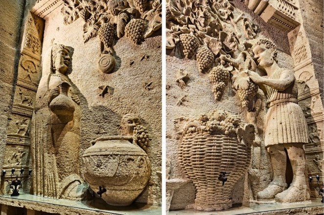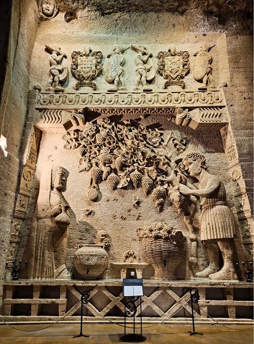 Wkraczając do tego niezwykłego świata, od razu dostrzeżemy wielką płaskorzeźbę oraz przestrzenie. Zabytkowa płaskorzeźba także autorstwa Francisca Valdiviego Gomeza ma prawie 13 metrów i przedstawia scenę zbioru winogron z rożnymi alegoriami zwierząt. Dwie główne postacie to kobieta w ciąży po lewej stronie i Túbal po prawej – ostatni wnuk Noego – którego poddani według legendy założyli Osunę. Pień winorośli jest złamany, jakby był piorunem, symbolem mocy. Po bokach przedstawiono kilka scen, takich jak potop powszechny, indalo (prehistoryczny symbol magiczny pochodzący z terenu Andaluzji) w Almerii czy jednorożce. Wreszcie u góry tarcze nazwisk Ramos i Lobo, nazwisk pary właścicieli. Całość inspirowana jest książką „Iberyjska Twierdza w Osunie” autorstwa Artura Engela i Pierre’a Parisa , którą napisali w 1906 roku.