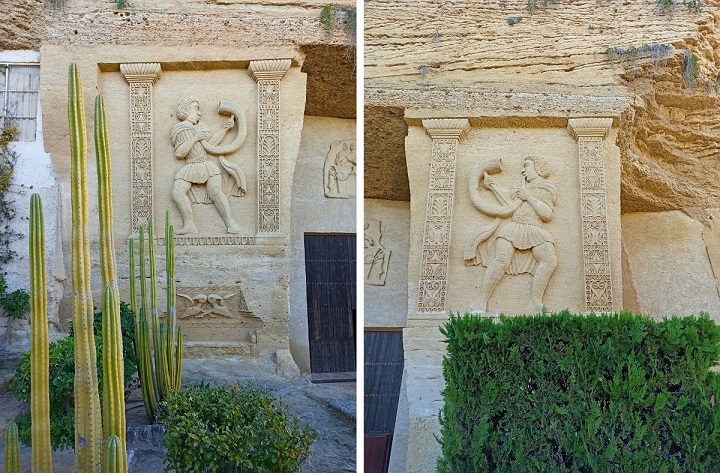 Pierwszym obiektem, na który zwrócimy uwagę są spektakularne rzeźby autorstwa Francisca Valdivii Gomeza. To artysta urodzony w Osunie już w wieku piętnastu lat nauczył się rzeźbić w drewnie i kamieniu. W 2004 roku dostał zlecenie na zrealizowanie figur dekorujących kamieniołom. Z dbałością o każdy szczegół, tworzył je przez kolejne lata, wzorując się na szkicach i fotografiach iberyjskich, które aktualnie znajdują się w Narodowym Muzeum Archeologicznym w Madrycie. Chciał, aby jego płaskorzeźby były jak najbardziej autentyczne, nawiązując do swojego oryginalnego pochodzenia. Dlatego też przy wejściu od razu dostrzeżemy dwóch waltornistów, którzy „strzegą” bram do wnętrza. Natomiast tarcza między dwiema komodami wzorowana jest na tarczy Osuny – dwa niedźwiedzie na łańcuchach trzymające te same kamieniołomy i gryf na nich.