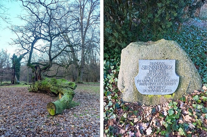 Park krajobrazowy otacza rezydencję i łączy się w naturalny sposób z krajobrazami i polami dawnego majątku znajdującego się nad Wartą. Aktualnie muzeum zarządza 27ha jego dawnego obszaru ze słynnymi dębami: Lechem, Czechem i Rusem. Ich wiek ocenia się na ponad 700 lat, a obwód pnia największego z drzew, Rusa, przekracza 9 m. W parku znajduje się ponad tysiąc drzew uznanych za pomniki przyrody. Zachwyt wzbudza też majestatyczny dąb Edward rosnący na nadwarciańskich łąkach. Po zwiedzaniu wnętrz Pałacu można sobie pójść do parku, przysiąść na ławce i rozkoszować się wielkopolskimi widokami.