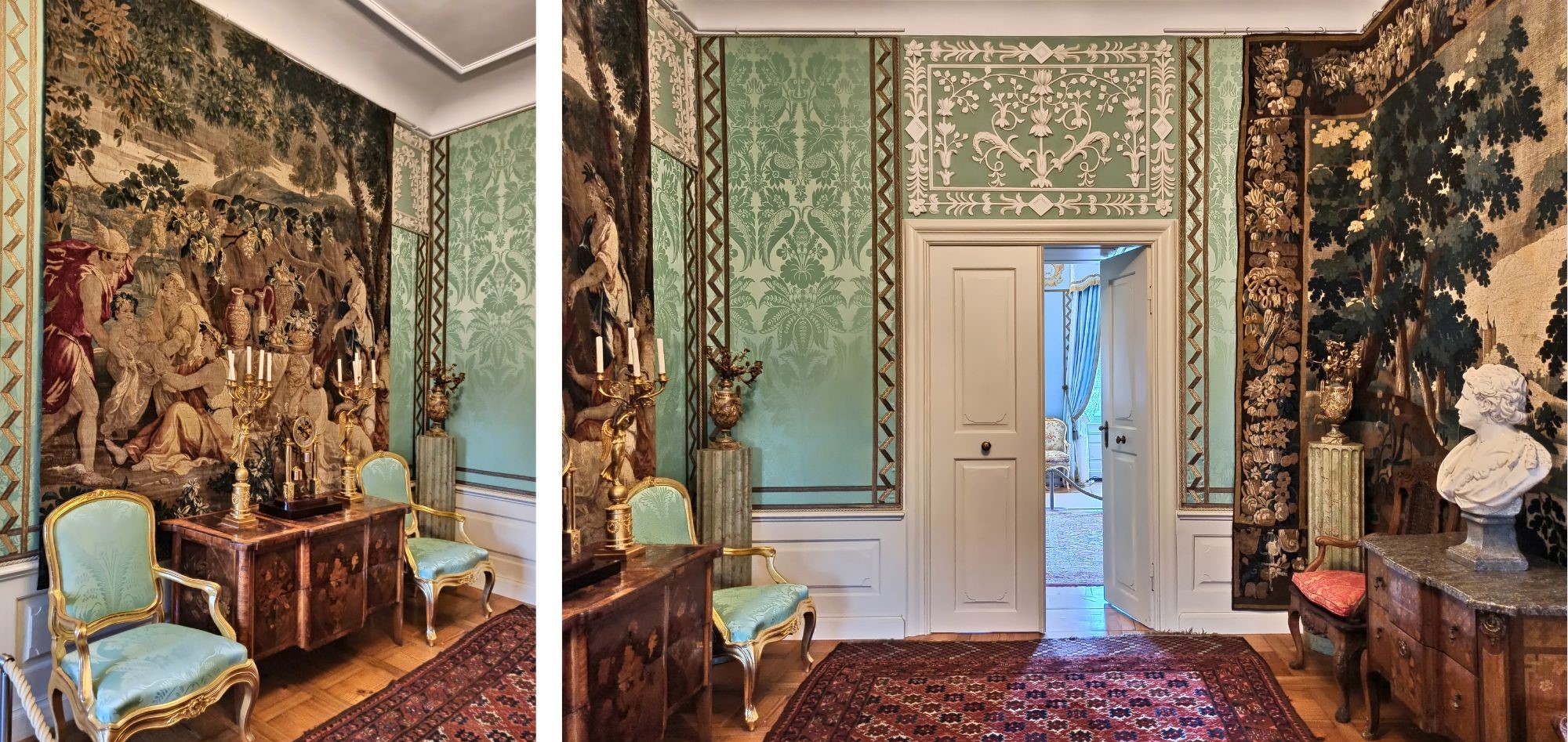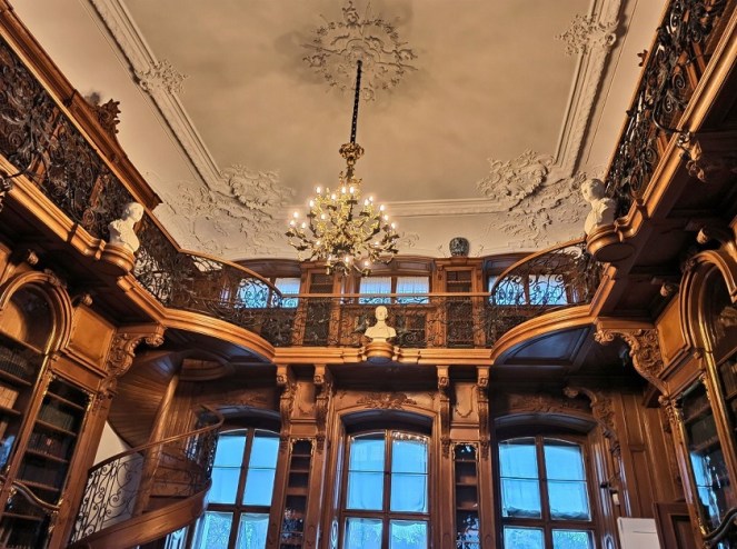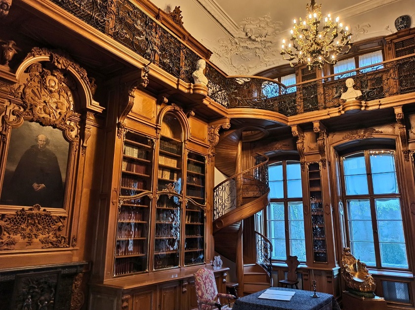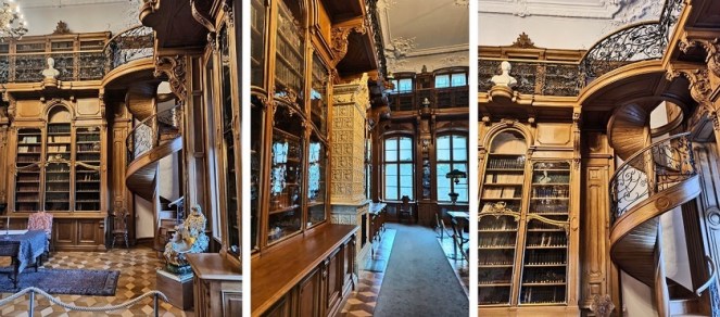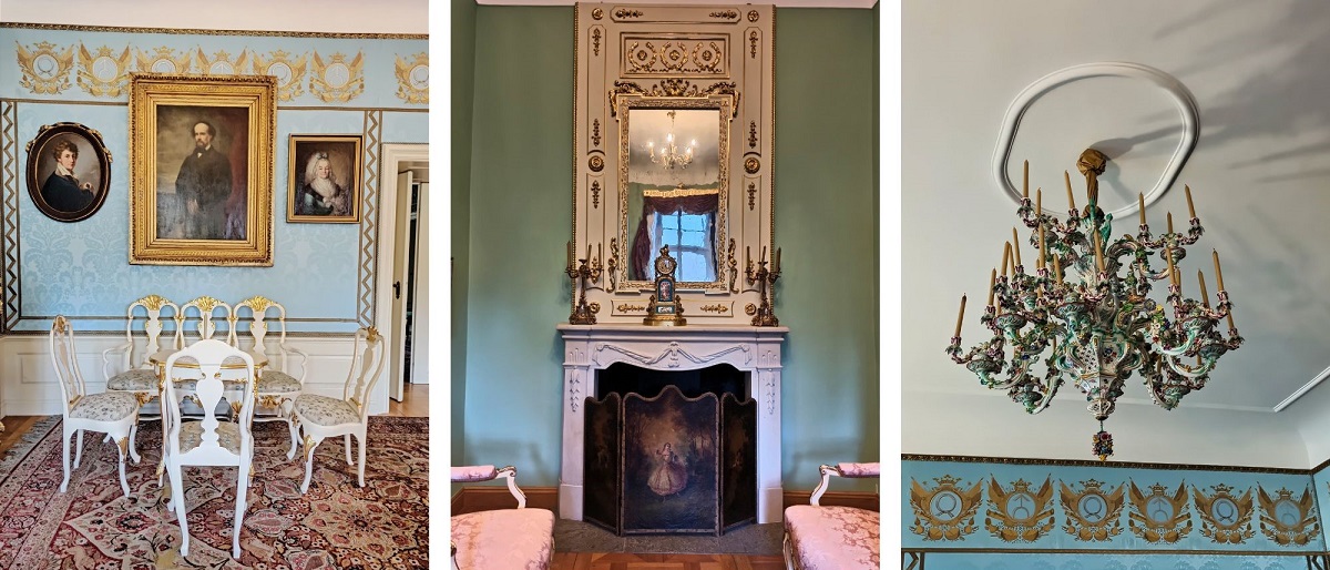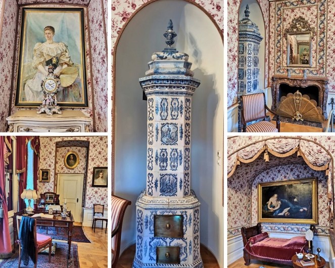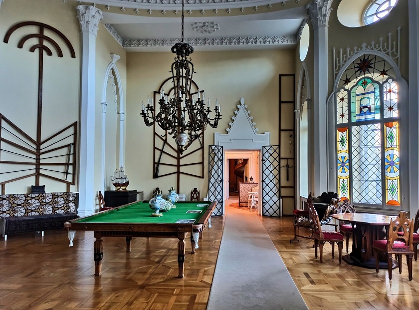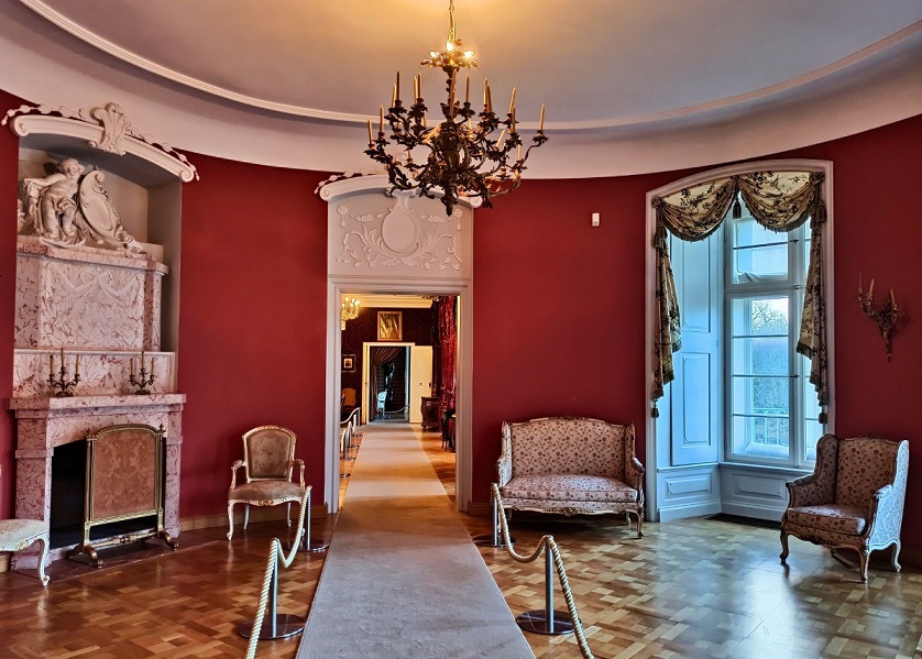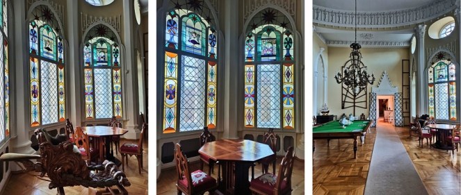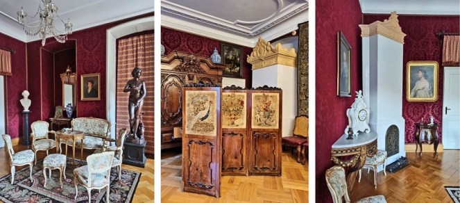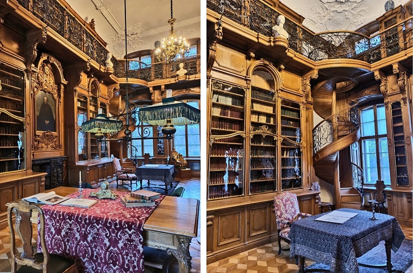 Wnętrza pałacu robią wrażenie. Zwiedzając aktualnie pałacowe wnętrza należy pamiętać, że ich wystrój jest to w przeważającej mierze rekonstrukcją zrealizowaną w ostatnich latach, choć wykonana z dużą pieczołowitością i dbałością o szczegóły. Widać tu ogrom pracy, którą włożono w przywrócenie dawnego blasku rezydencji. Na uznanie zasługują odbudowane na podstawie pojedynczych kafli i przedwojennych zdjęć piece, zrekonstruowane lub zakupione na aukcjach stare kominki. Największe jednak wrażenie robi wystrój hrabiowskiej biblioteki – pieczołowitość wykonania poszczególnych elementów i detali dębowych szaf, boazerii, kutych elementów oraz majestatycznych schodów jest wręcz olśniewająca. W bibliotece dostrzeżemy również piec kaflowy oraz imponującą kolekcję starych ksiąg, chociaż znaczna większość księgozbioru zaginęła w niejasnych okolicznościach. Wszystkie wnętrza odtworzono między innymi na podstawie oryginalnych plansz projektowych w stanie maksymalnie zbliżonym do oryginalnego. We wszystkich pomieszczeniach zadbano o detale i wiarygodność całego pałacu. Nie powiem, kawał świetnej roboty 🙂