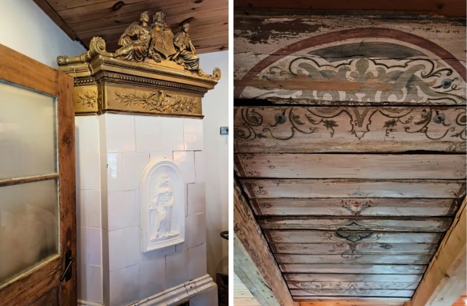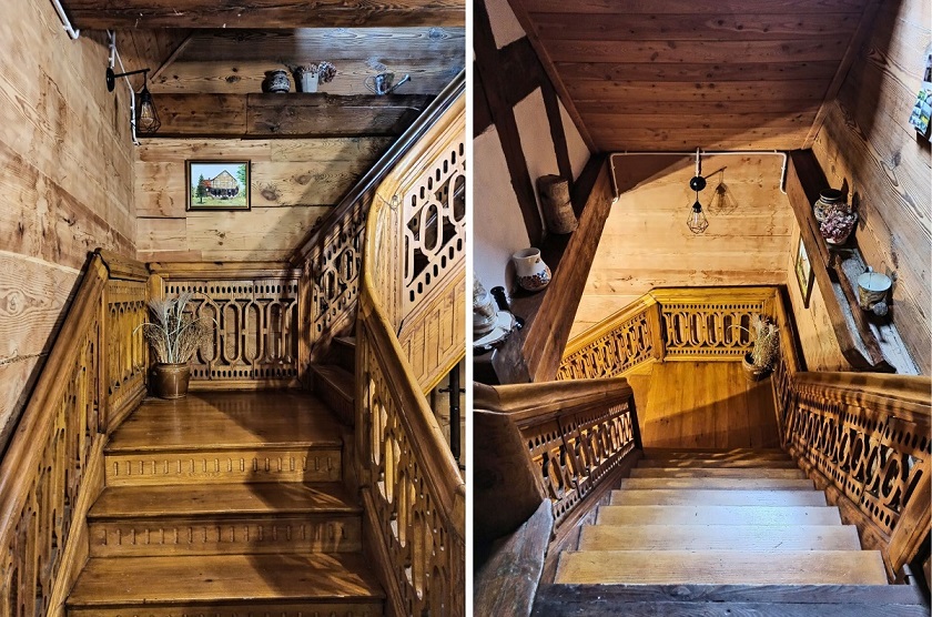 Wnętrza wszystkich domów były do siebie podobne. Składały się z wielkiej izby, pokoju letniego, czarnej i białej kuchni, sieni głównej oraz pomieszczenia gospodarczego. Dodatkowe pokoje takie jak sypialnia zależne były od wielkości domu. Najczęściej wielka izba wytyczana była w południowej części budynku i przylegała ona bezpośrednio do czarnej kuchni, w której gotowano posiłki na otwartym palenisku. Do kuchni czarnej przylegała biała, w której przygotowywano posiłki wymagające gotowania. Sień główna była częścią reprezentacyjną przed wejściem głównym. Sień gospodarcza stanowiła granicę pomiędzy częścią mieszkalną i gospodarczą, w mniejszych domach oddzielała dom mieszkalny od budynków rolniczych. Wnętrza domów zdobiły schody z ozdobną balustradą, efektowne piece kaflowe, ozdobne płytki ceramiczne- tzw. flizy i meble ścienne. Na specjalną uwagę zasługują także bogato zdobione drzwi – niektórzy uważają, że są one najpiękniejsze w całym regionie.