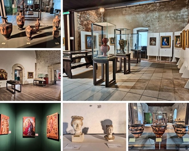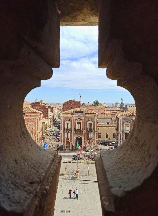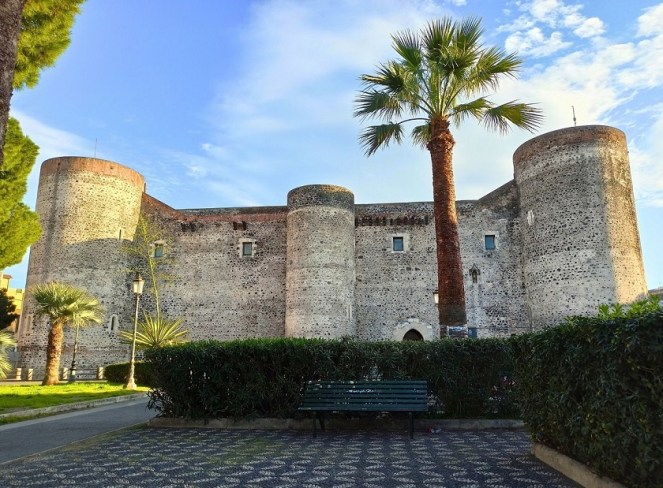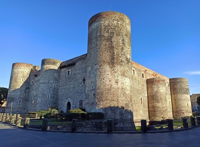 Oczekiwałam wiele, a dużo nie dostałam. Jako miłośniczka zamków sądziłam że obiekt ten powali mnie na kolna. No tak się nie stało. Forteca zdecydowanie lepiej prezentuje się na zewnątrz niż w środku. Ten XIII-wieczny zamek aktualnie stoi pośrodku dzielnicy mieszkalnej, choć w momencie budowy znajdował się na samym brzegu morza, na klifie, a jego głównym zadaniem była obrona dostępu do miasta od strony wody. Po wybuchu wulkanu w XVII wieku linia brzegowa przesunęła się o ponad kilometr, a twierdza znalazła się w głębi lądu. Zamek ma bardzo grube, ponad dwu metrowe mury. Obecnie mieści się tam muzeum miejskie (Museo Civico al Castello Ursino), gdzie można zobaczyć m.in. wykopaliska archeologiczne i mozaiki, ceramikę, wystawę broni i rzeźb. Przekrój czasowy ekspozycji jest bardzo szeroki – od czasów antycznych, przez średniowiecze, aż do XVIII wieku. Jak dla mnie to nic specjalnego w środku nie ma, takie zbiorowisko wszystkiego po trochu, żeby nie powiedzieć graciarnia.
