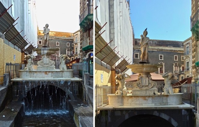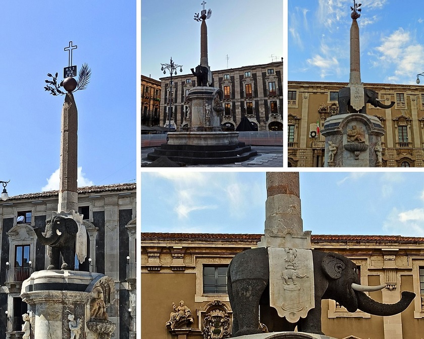 Centralnym punktem placu jest przyciągająca wzrok Fontanna Słonia – jeden z rozpoznawalnych symboli Katanii. Oczywiście wtedy, kiedy ja tam byłam, fontanna była zagrodzona, bo trwał remont tej części placu. Nie przeszkadzało mi to jednak, żeby zrobić zdjęcia temu dziwnemu obiektowi. Spieszę z wytłumaczeniem, co autor miał na myśli, tworząc ten monument. Centralnym elementem jest słoń wyrzeźbiony z lawy wulkanicznej, który na swoich plecach dźwiga egipski obelisk poświęcony bogini Izydzie. Ten ostatni wykonany jest z granitu, ozdobiony innymi egipskimi motywami, które jednak nie są hieroglifami. Dodatkowo, słoń ubrany jest w siodło z heraldyką św. Agaty. Uważa się, że jego rzeźba pochodzi z okresu średniowiecza i została jedynie odrestaurowana, chociaż istnieje teoria, że powstała już w czasach antycznych. Według legendy jego twórcą był czarnoksiężnik imieniem Heliodor, który latał na nim wzbudzając postrach u mieszkańców. Fontanna miała symbolizować odrodzenie Katanii po trzęsieniu ziemi, które nawiedziło Katanię w 1693 roku.