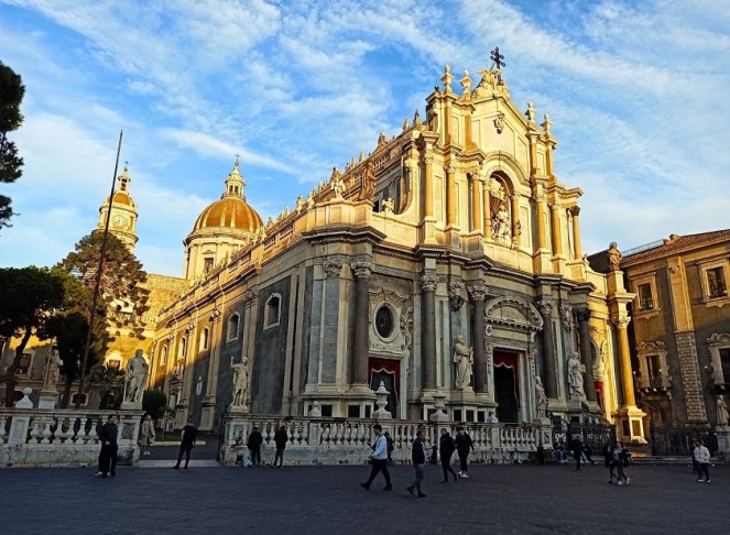 Święta Agata jest patronką Katanii, a więc nic dziwnego, że na jej cześć nazwano wielką katedrę (bazylikę) i jeden z najważniejszych zabytków w mieście. Katedra znajduje się w samym centrum miasta, na Placu Duomo, a jej charakterystyczna kopuła wznosi się nad miastem. Mieszkańcy miasta wierzą, że świątynia stanęła na miejscu, gdzie św. Agata zginęła męczeńską śmiercią. Zbudowana została na miejscu XI-wiecznego kościoła, który został w dużej części zniszczony w trakcie trzęsienia ziemi w 1693 r. Z oryginalnej budowli nie zachowało się zbyt wiele – w nienaruszonym stanie przetrwała jedynie apsyda oraz fragmenty wież i transeptuFasada katedry to rzędy korynckich, granitowych kolumn, rozmieszczonych na trzech poziomach. Kolumny znajdujące się przed katedrą ozdobione są marmurowymi rzeźbami z wizerunkami m.in. św. Agaty i św. Eupliusza. Wewnątrz można zobaczyć charakterystyczne elementy ambony i świecznika, wykonane z zastygłej lawy. Wnętrza skrywają też relikwie św. Agaty, z których szczególne znaczenie ma przechowywany tutaj welon. Warto też wiedzieć, że w katedrze pochowany jest wybitny kompozytor operowy Vincenzo Bellini – twórca włoskiej opery romantycznej i prywatnie przyjaciel naszego Fryderyka Chopnia.