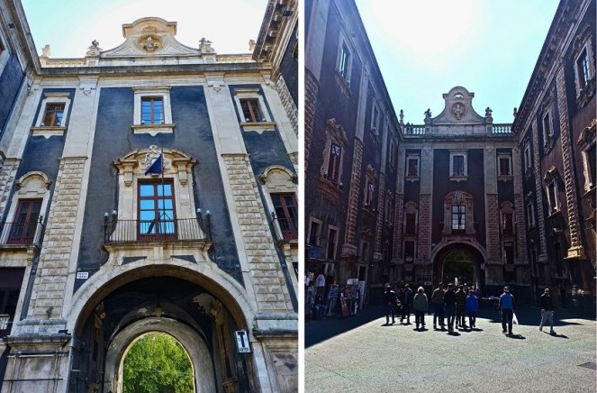 Między tymi budynkami przebiega ulica, która prowadzi do wzniesionej pod koniec XVII wieku bramy Porta Uzeda. Brama została nazwana na cześć Paceco Uzedy, który wspierał dążenia do odbudowy miasta po silnym trzęsieniu ziemi. Stojąc twarzą do katedry, po prawej stronie jest właśnie ta brama, której nie da się jej nie zauważyć.