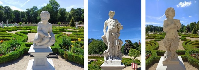 Pałac wchodzi w skład zespołu pałacowo-parkowego. Oprócz barokowej budowli zespół zawiera ogród dolny i górny, w stylu angielskim i francuskim. Francuska część, zaplanowana na rzucie czworoboku, z licznymi klombami i fontannami, leży bezpośrednio przy pałacu. Zdobna część angielska, czyli ogród dolny, urozmaicona jest natomiast licznymi pawilonami, altankami, a także posągami, tematycznie nawiązującymi do mitologicznych bóstw.
