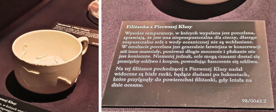 Na tej niezwykłej ekspozycji możemy podziwiać Znajdziemy tam też autentyczne, duże fragmenty statku, w tym m.in. stanowisko sterowania, masywne stalowe drzwi prowadzące na pokład, telegraf oraz okno z oficerskiej kajuty, które niegdyś oferowało widok na bezkresny ocean. Wśród eksponatów znajdują się również unikalne elementy wyposażenia, takie jak elegancka porcelana, pięknie zdobione sztućce, stylowe lampy oraz naczynia kuchenne, które były świadkami codziennego życia na pokładzie. Każdy z tych przedmiotów opowiada swoją własną historię o niewyobrażalnym luksusie i niezwykłości, które uczyniły Titanica ikoną swojej epoki. Te unikalne artefakty były wydobywane z wraku statku od lat 80. XX wieku przez współorganizatora tej wystawy, RMS Titanic, Inc. – jedynej instytucji autoryzowanej do wydobywania i konserwacji artefaktów z Titanica.