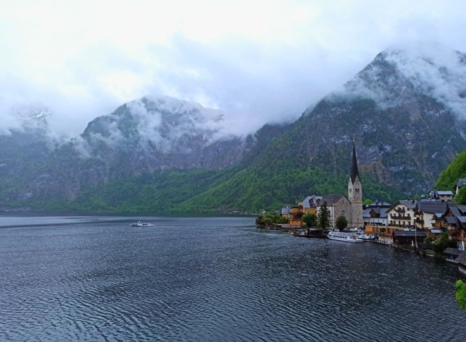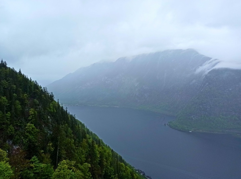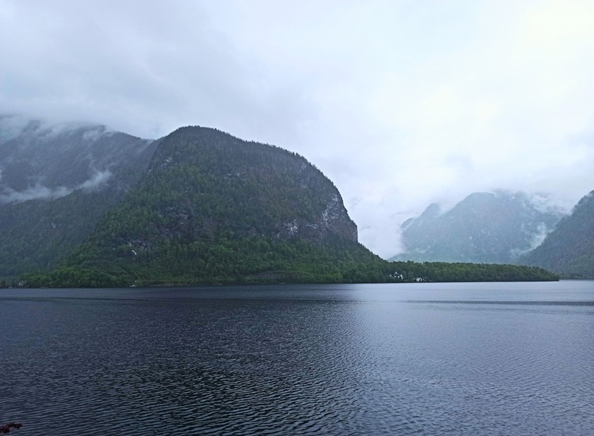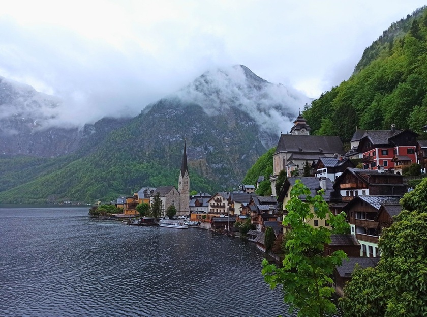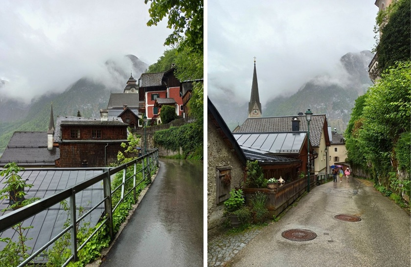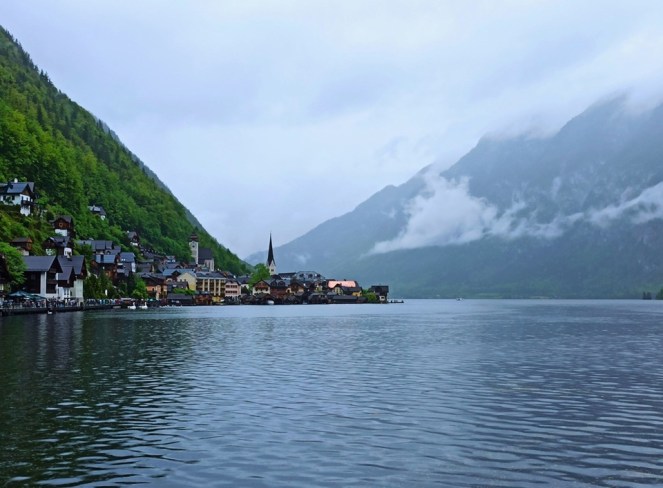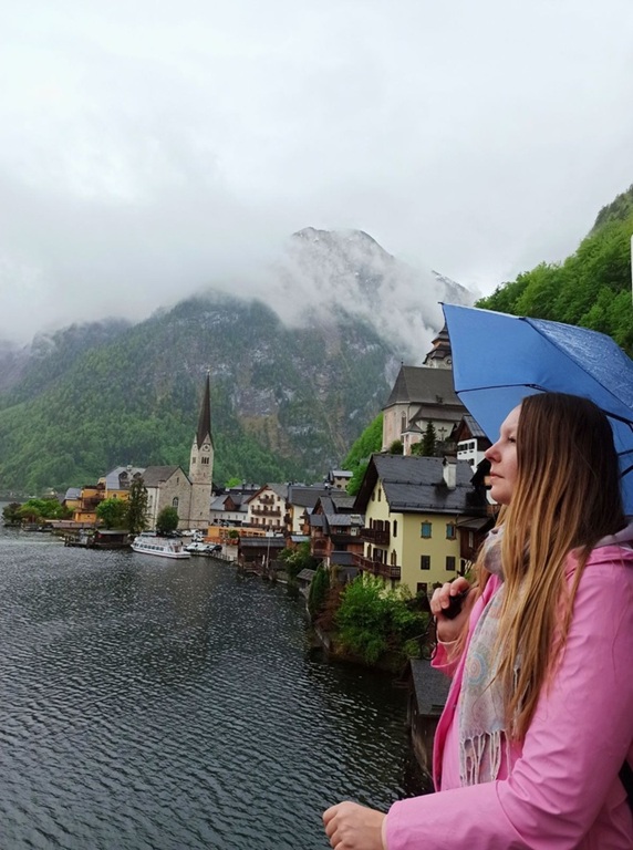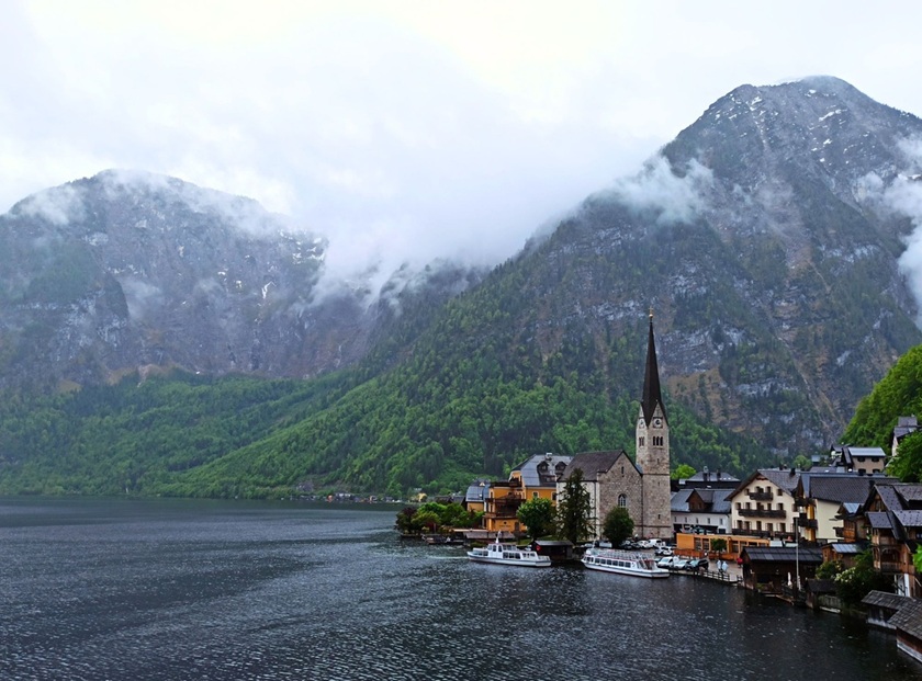Pogoda tego dnia nie była łaskawa. Hallstatt przywitał nas deszczem oraz mgłą spowitą nad miasteczkiem. Nie są to komfortowe warunki do eksplorowania  i zachwytu nad bajkowymi, pocztówkowymi widokami. Mnie deszcz nie zraził, bo od dawna Hallstatt był wysoko na mojej podróżniczej liście marzeń. I wiecie co? Nie zwiodłam się, a mgła rozciągająca się nad górami zrobiła mega klimat.