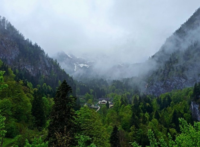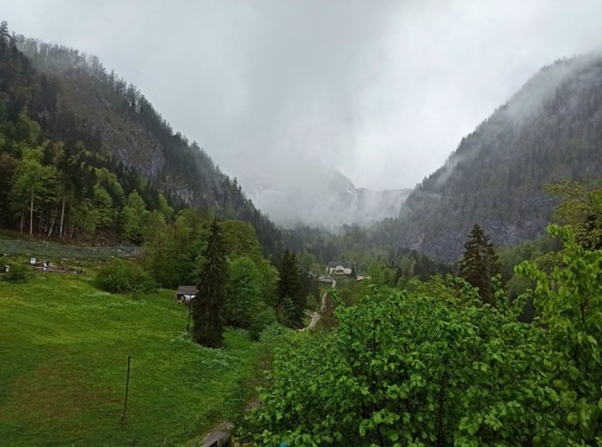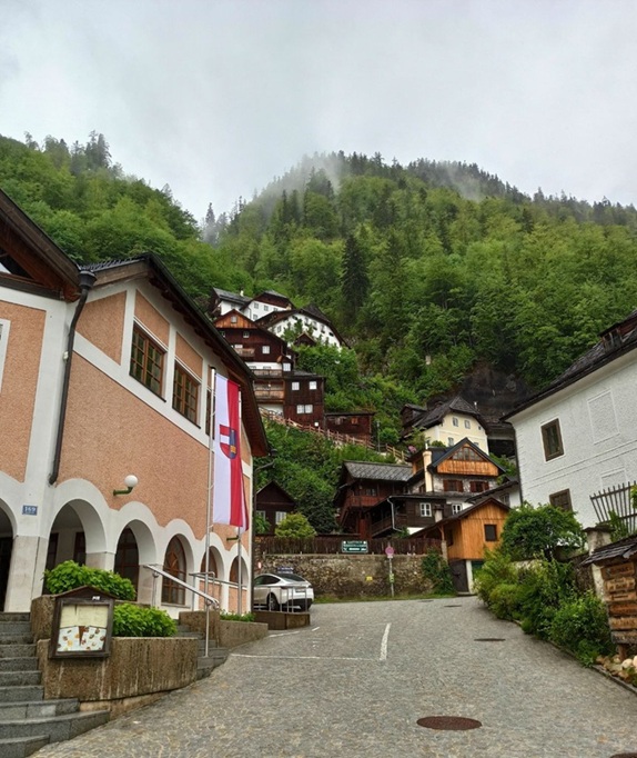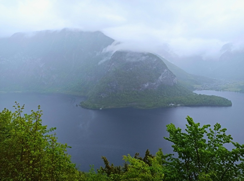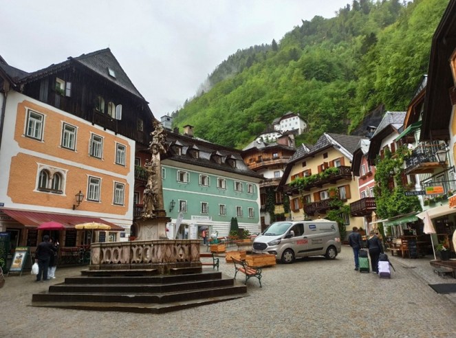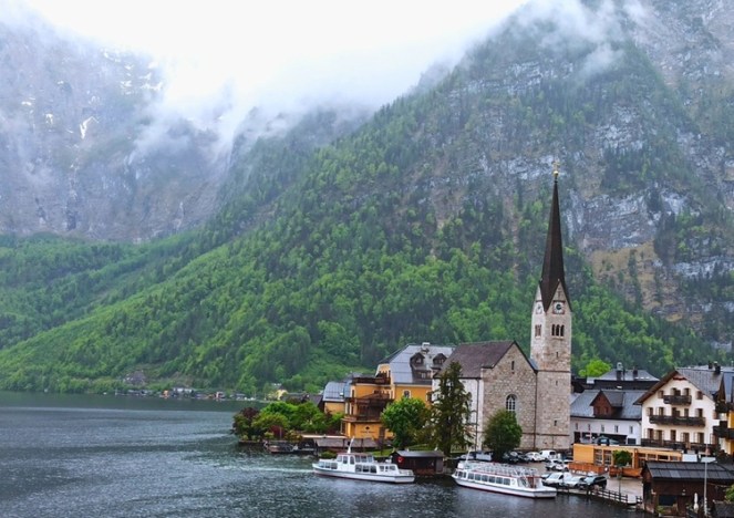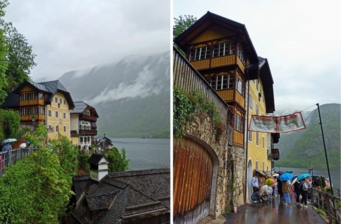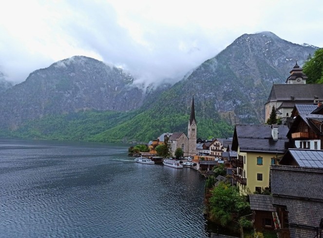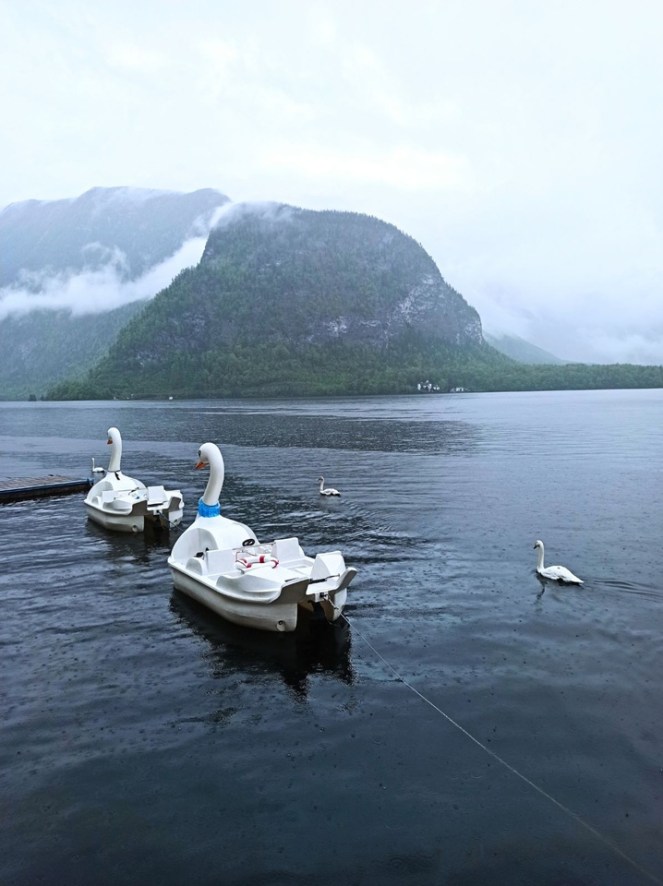 Pogoda tego dnia nie była łaskawa. Hallstatt przywitał nas deszczem oraz mgłą spowitą nad miasteczkiem. Nie są to komfortowe warunki do eksplorowania  i zachwytu nad bajkowymi, pocztówkowymi widokami. Mnie deszcz nie zraził, bo od dawna Hallstatt był wysoko na mojej podróżniczej liście marzeń. I wiecie co? Nie zwiodłam się, a mgła rozciągająca się nad górami zrobiła mega klimat.
