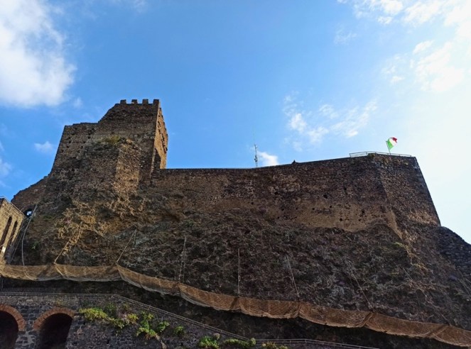 Znajdujący się na wysokim klifie, tuż nad brzegiem lazurowego morza, robi wielkie wrażenie. Widać go z daleko, bo zdecydowanie góruje nad miasteczkiem. Co czyni go takim atrakcyjnym? Właściwie to wszystko 🙂 Ale może zacznę od tego, że ma nietypową budowę, bo przypomina nieco statek. Druga sprawa – znajduje się na wulkanicznym klifie a to, że zbudowany jest z ciemno bazaltowej skały sprawia wrażenie, że jest stopiony z klifem. No i trzecia sprawa – widoki rozciągające się z góry zamku – to chyba jednak największa zaleta tego miejsca 🙂 Ale po kolei.