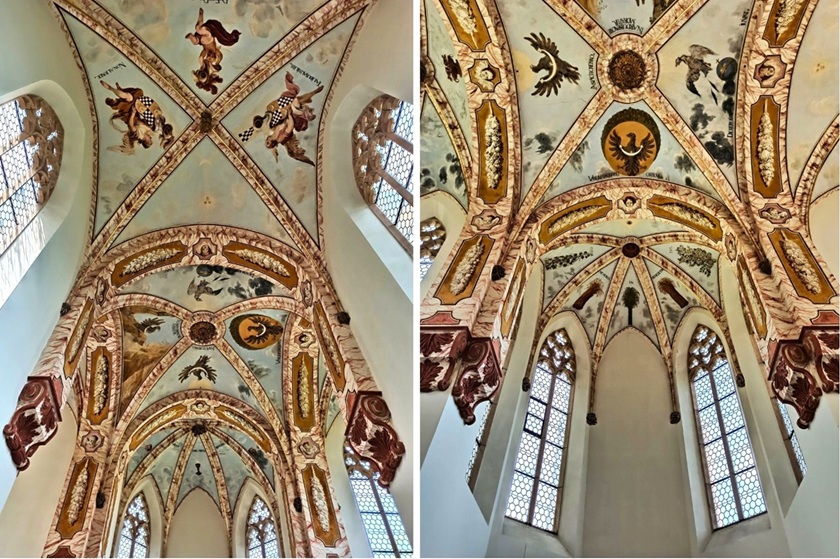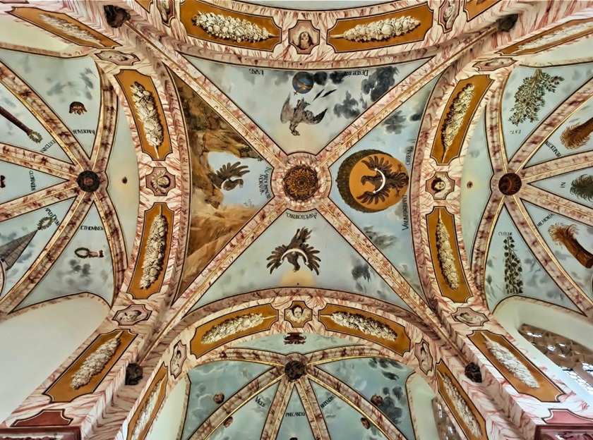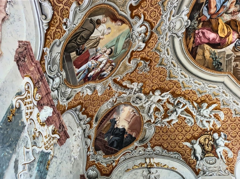 To, co również przykuwa naz wzrok to plafon o wymiarach 28 m x 14 m (300 m kw.) z malowidłem, które nosi tytuł „Zwycięstwo Wiary katolickiej nad herezjami i niewiernymi”. Jego autorstwo przypisuje się Christianowi Bentumowi. Na plafonie dostrzeżemy Matkę Boskę, gołębicę jako symbol Ducha Świętego, a także dzieciątko Jezus. Nie mogło także zabraknąć ukazania siedmiu cnót chrześcijańskich. Jeśli dobrze się przyjrzymy, to dostrzeżemy pewną sztukę iluzji – w jednym miejscu mamy wręcz dzieło 3D, bo obraz przechodzi w elemnt będącym fragmentem rzeźby/sztukaterii.