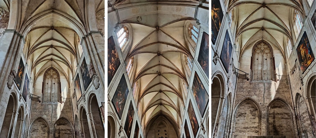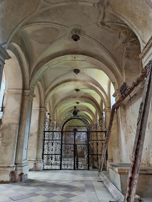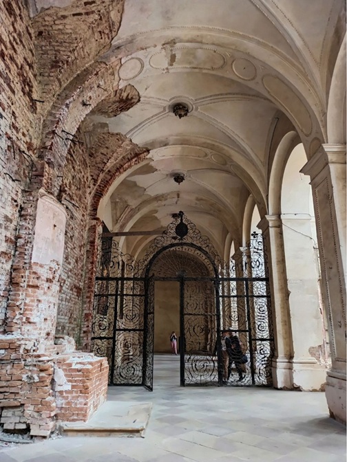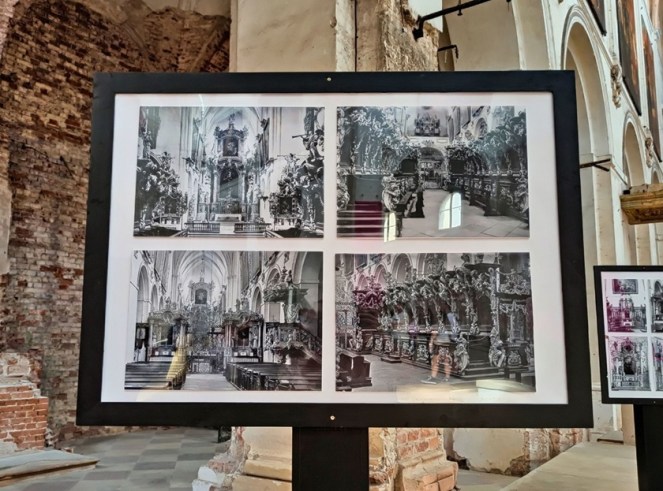 Po podziwianiu pięknych barokowych wnętrz, przenosimy się do zupełnie innego świata. Wnętrze tego kościoła sprawia wrażenie, jakby się własnie budował. W rezeczywistości jest zupełnie inaczej, bowiem miejsce to zostało zdesakralizowane. Nsz wzrok przykuwają gołe i obdrapane ściany, na których próżno szukac jakiś ozdobników. Kiedyś kościół wypełniały obrazy autorstwa Michała Willmana oraz piękne, bogato zdobione drewniane stalle (czyli siedziska ustawione przy bocznych ścianach prezbiterium, przeznaczone głównie dla duchownych. Widać je na zamieszczonym poniżej starym zdjęciu, zrobionych przed wojną. Potem nastały czasy II wojny światowej, gdzie Niemcy ukradli większość cennych obiektów, a jak weszli tu Ruscy, nie pozostało tu niemal nic poza murami. O dawnej świetności przypomina jedynie brama oddzielająca część klauzurową od świeckiej. W jednym miejscu dotrzeżemy takżę wielką ramę po obrazie Willmanna, która jakimś cudem uniknęła spalenia.