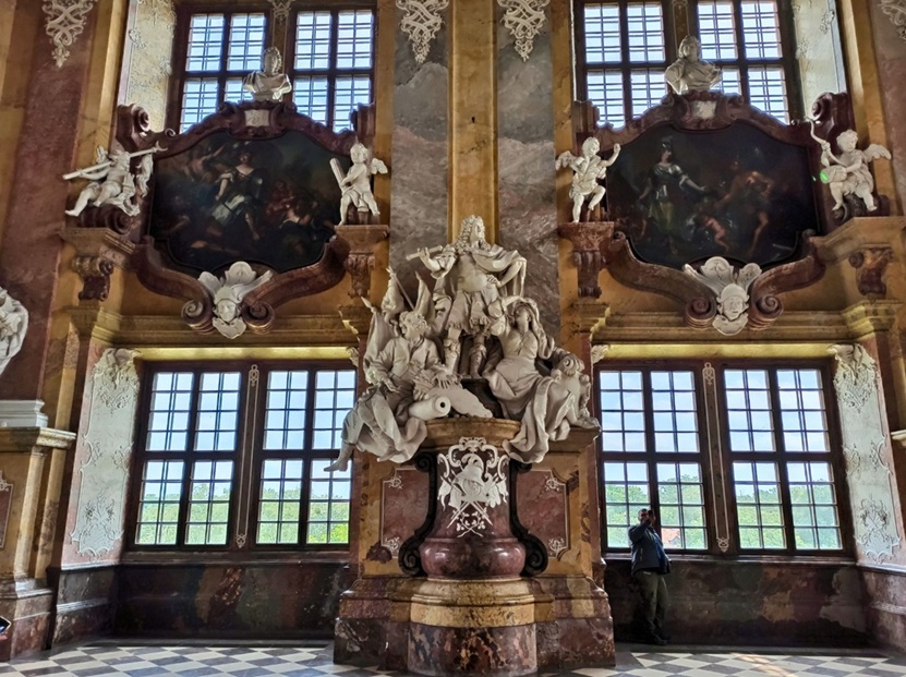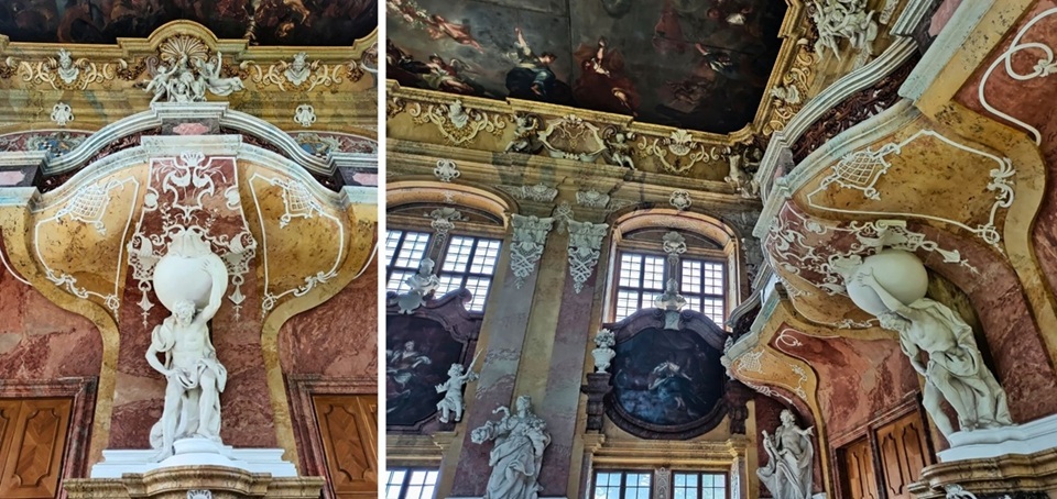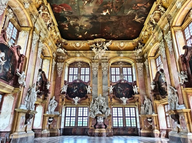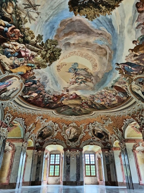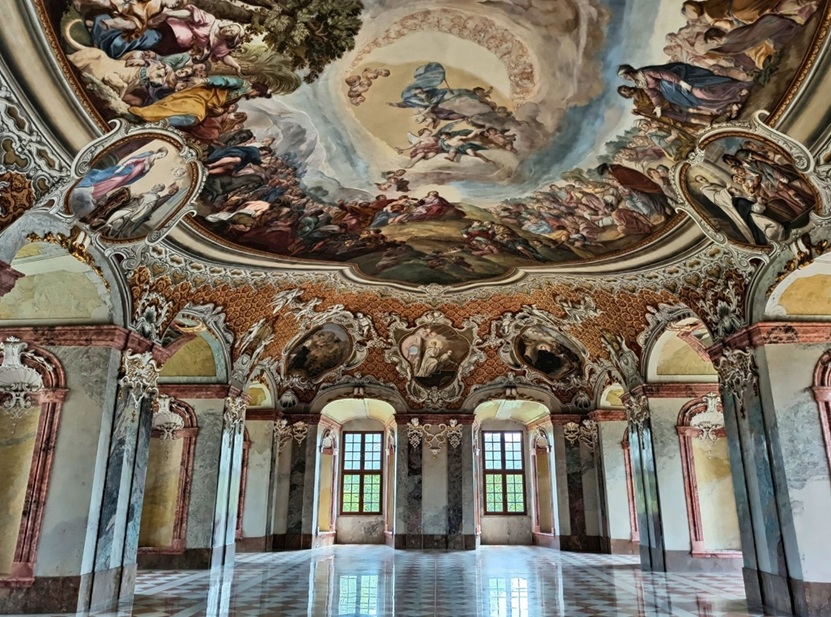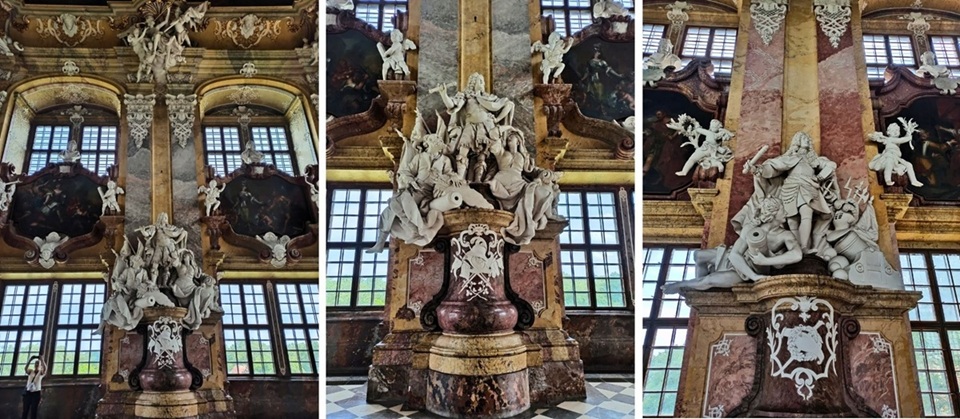 To pierwsze pomieszczenie, od którego rozpoczynamy zwiedzanie. Już na wstępie sala robi wrażenie, ale to dopiero przedsmak tego, co czeka nas dalej. Na suficie znajduje się malowidło autorstwa Michała Willmana oraz bogata sztukateria. Artysta mówił o nim, że jest to pierwszy tak wielki fresk w jego karierze. Willman nazywany był śląskim Rembrandtem, który 43 lata swojego życia spędził w Lubiążu. Tu tworzył i tu pozostawił spory kawałek swojego artystycznego dorobku. Malowidło powinno się oglądać z węższego brzegu sali, wtedy dokładnie widzimy jego fenomen.