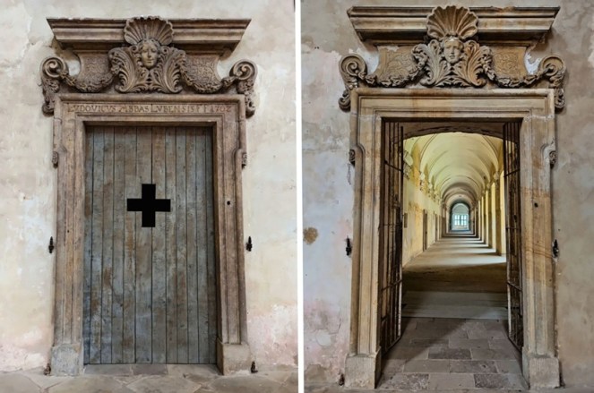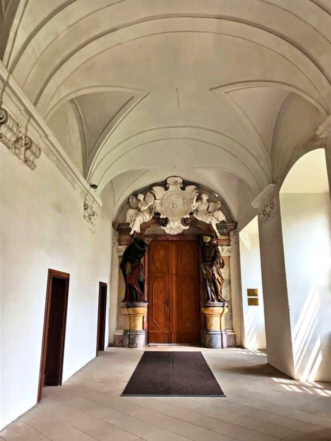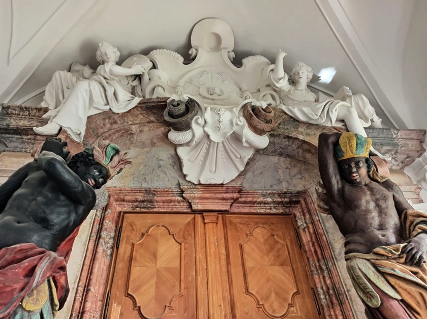 Przedsmakiem tego, co czeka nas wewnątrz, są drzwi prowadzące do Sali Książęcej, które również robią wrażenie. Wejścia strzegą dwie postacie: Indianin i Murzyn. W XVII wieku wszystko to, co co inne i dalekie, a wręcz egzotyczne było bardzo popularne. Te dwie postacie podtrzymują ozdobny portal w postaci tarczy z herbem opata.