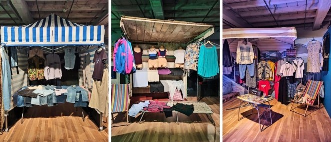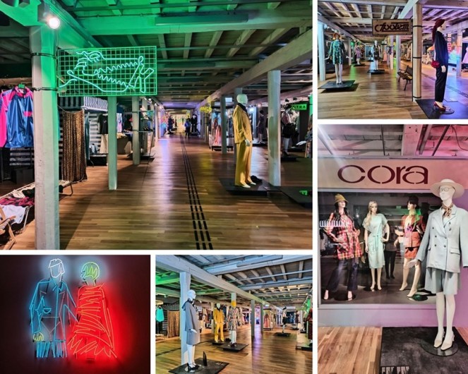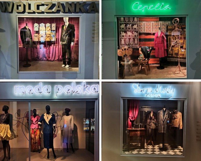 Drugie piętro dedykowane jest modzie, którą deklinujemy przez wszystkie przypadki miasta. To według mnie najciekawsza część tej wystawy. Po najdłuższym wybiegu modowym – ulicy Piotrkowskiej – przechadzają się wystrojeni łodzianie, a witryny sklepowe, neony i szyldy wołają o uwagę przechodniów. Telimena, Nestor, Moda Polska, Hoffland – marki i metki egzystują na równych prawach ze strojami przerabianymi i szytymi w domach. Ekspozycja ta otrzymała nagrodę Plaster Kultury 2021 w kategorii „Wystawa roku”.
