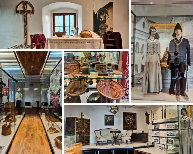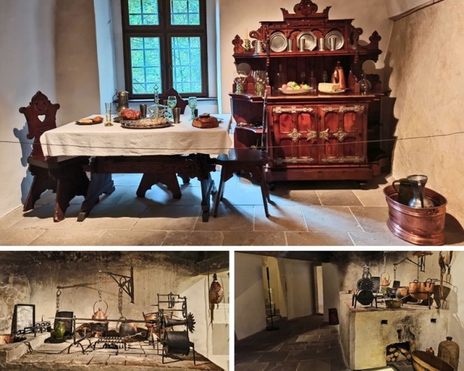 Centralnym punktem kuchni był piec lub kominek, w którym przygotowywano posiłki. Mechaniczny rożen, zainstalowany obok pieca, był regularnie używany do pieczenia mięsa. Stary węgierski przepis na kurczaka z XVII wieku jest przedstawiony na tablicy informacyjnej prezentowanej na wystawie.